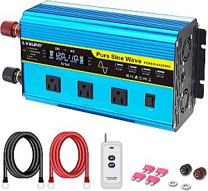 ■4ファンと大型インバーター並みの空冷対策 ■リモコンに由るON/OFFスイッチが付属(バッ直で容量に余裕がないのでモニターを見て容量が少なくなってきたとなればOFF出来る) ■通常のDC/ACメーターに加え簡易だと思うがバッテリー量とLOAD(負荷)モニター付き ■通常ヒューズはハンダ付けされていたりするが、50Aのヒューズが4本付属の交換式基盤 ■50/60ヘルツ切り替えあり ■付属の電線は16sq ■全体の作りと機能を見比べると1000Wより1600Wのこちらが価格差以上の安心感あり ■リモコンは、電池12V23A 本体のメイン電源OFF状態で、ON/OFF可能 本体のメイン電源ON状態では、機能しない ■付属のケーブル【02(rv) 450/750v 16mm】は、85A リモコンのON/OFFが行い易い場所に設置 横にはバッテリーメーターも設置(バッテリー電圧で%が前後するだけなので充電が間に合っているかいないかの視認適目安。) |