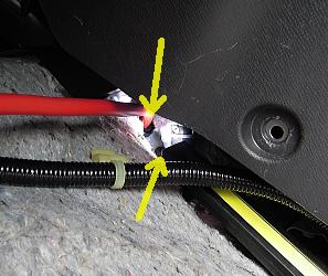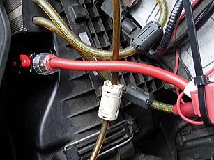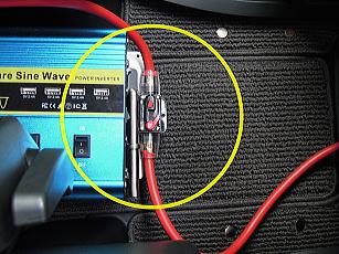 センターコンソール下部から引き出し サーキットブレーカーをインバーター前に設置し誤操作を防ぐ 100Aサーキットブレーカーを介しプラス端子へ |