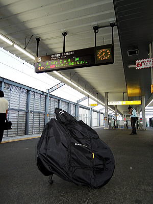JR中央線勝川駅 5:47分発名古屋行きで出発 2014.6月よりJR規定が厳格化され輪行袋から車体が出ている事が認められなくなりました。 私の場合、サドルが袋から出ますので、黒のナイロン袋を被せて見た目の対応をして乗降。 一応、駅員、車掌等問題視されること無く通過 |