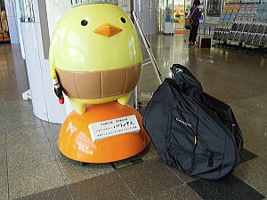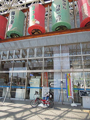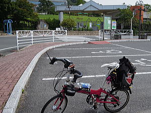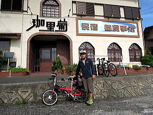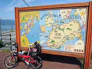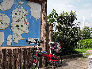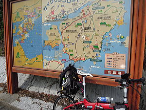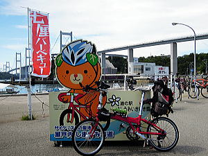 今治駅 10:41分着 バリーさんと記念撮影後、観光案内所で、しまなみパンプを入手し、駅前のサイクルスタンドで組み立て出発 |