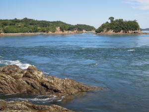 『村上水軍館』から海岸線を進み伯方・大島大橋へ向かうと海峡が川のように流れ渦を巻いている様に驚きました。 その昔、この海流を手漕ぎで航行していたのは驚き |