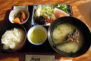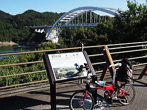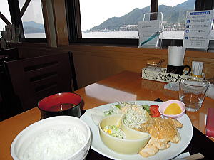 橋を渡り、大島の道の駅『よしうみいきいき館』で腹ごしらえです。12:00 橋の上で会話した仙台からの大学生で四国一周の安西君と再び会話。 帰りに名古屋も通過するとのことなので、時間が合えば『カントリーキッチン』においで食事を御馳走するよと言って別れました。 |